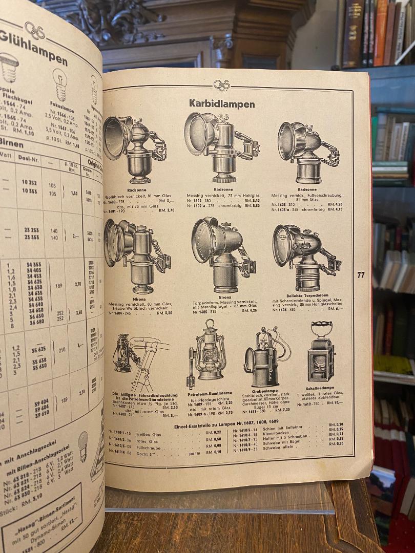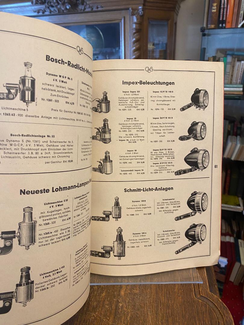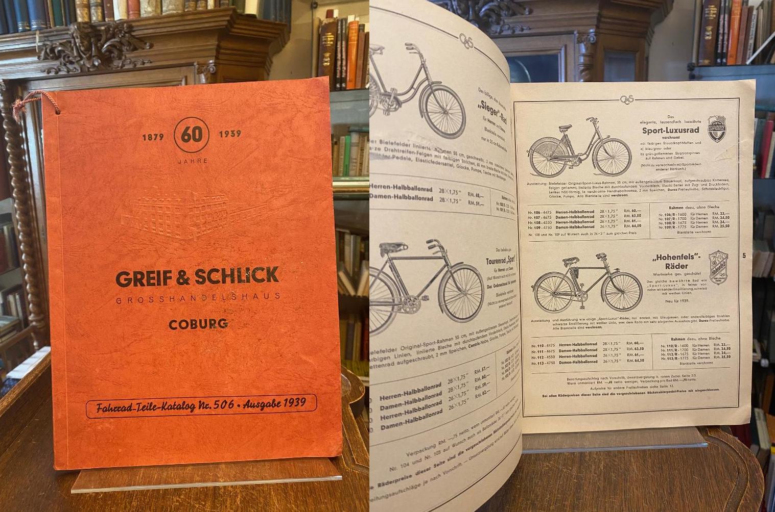 Greif & Schlick, Coburg (Hrsg): Fahrrad-Teile-Katalog Nr. 506 – Ausgabe 1939 : [Jubiläumskatalog 60 Jahre 1879 – 1939]. Coburg, Greif und Schlick : Grosshandelshaus, 1939. 4° (31x24), 152 S., reich illustriert, mit Preisangaben, rote OKart (Brosch) mit Titeldruck, Kordelschlaufe zum Aufhängen, die ersten 2 Blatt mit kleiner säurefrei reparierten Verletzung, sonst sehr schön, kaum genutzt,