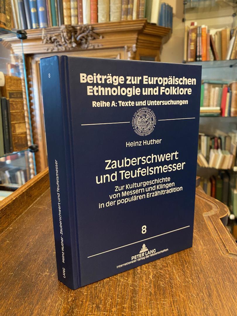 Huther, Heinz: Zauberschwert und Teufelsmesser : Zur Kulturgeschichte von Messern und Klingen in der populären Erzähltradition. Frankfurt/M u.a.. Peter Lang : Internationaler Verlag der Wissenschaften, 2013. 8° (22x15), 413 S., 1 Bl., mit zahlr. Abb. im Tafelteil, OPbd, ohne Gebrauchsspuren, offensichtlich ungelesen, frisch, [= Beiträge zur Europäischen Ethnologie und Folklore : Reihe A (Texte und Untersuchungen); 8 : herausgegeben von Leander Petzoldt], Schneidende und stechende Werkzeuge, vom Messer bis zur Schere, Beil und Axt, und Hieb- und Stichwaffen wie Schwert, Säbel und Dolch sind in populären Volkserzählungen, insbesondere in Sage, Märchen und Schwank, unentbehrlich und als Reflex der in ihnen gespiegelten Lebenswirklichkeit fast allgegenwärtig. Die Texte und die ihnen gewidmete Forschung behandeln sie auffällig beiläufig, fast geringschätzig. Die zutreffende Bewertung ihrer Rolle setzt eine umfassende Bestandsaufnahme und den Vergleich ihrer Erscheinungsformen voraus. Die hiermit vorgelegte Bestandsaufnahme berücksichtigt ausgehend von den Märchen und Sagen des Altertums, des Mittelalters und der Neuzeit auch das europäische und das deutsche Kunstmärchen. Über 140 ausgewertete Sammelwerke dürften einen repräsentativen Überblick ermöglicht haben. Populäre Erzählungen fast aller Zeiten und Völker, insbesondere aber Märchen, schildern Zerstückelungen von Menschen und Tieren, vor allem Enthauptungen, was zu intensiven Diskussionen über die Zuträglichkeit solcher Themen nicht nur für Kinder führt. Die bisherigen Deutungen des Phänomens werden gesichtet, ergänzt und erweitert. Als wesentliche Funktionen schneidender und stechender Geräte kommen die des schlichten Werkzeuges in Betracht, die des Verbrechenswerkzeuges, aber auch – nicht selten als Teil einer magischen Dreiheit – die als Träger dieser Magie, als Brücke in das Reich des Jenseitigen und nicht zuletzt als Manifestation des Unbewussten. Linien in die Gegenwart volkstümlicher Literatur schließen die Gesamtschau ab. (Verlag)