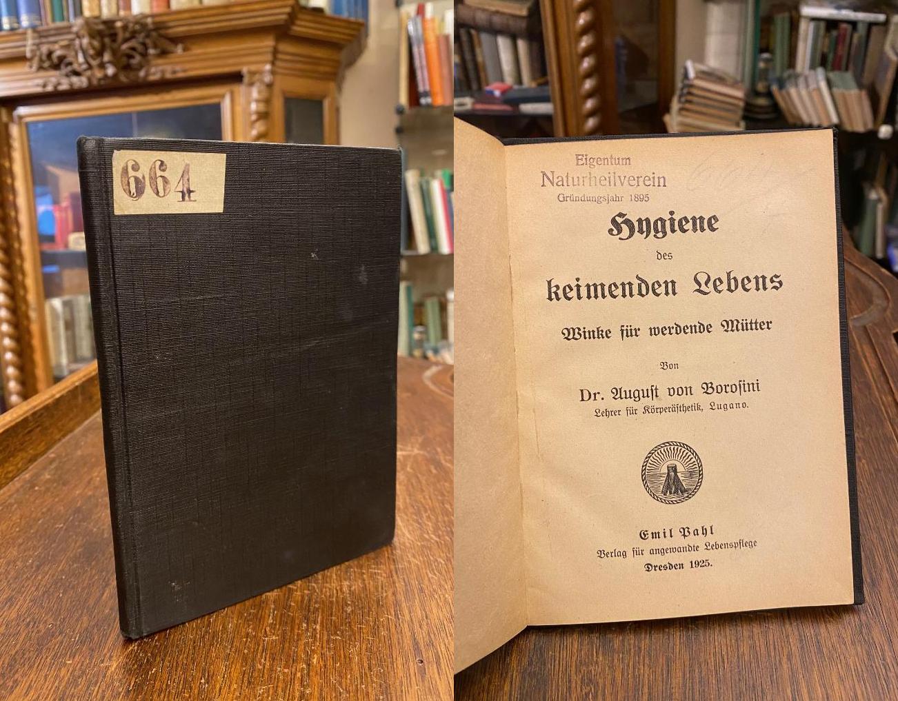Borosini, August von: Hygiene des keimenden Lebens : Winke für werdende Mütter. Dresden, Emil Pahl : Verlag für angewandte Lebenspflege, 1925. 8° (18x13), 47 S., 4 Bl. Verlagsanzeigen, schlichter schwarzer Pbd d. Zt., Etikett, Stempel auf Titel (Naturheilverein 1895, Wien), sauber und wohlerhalten,