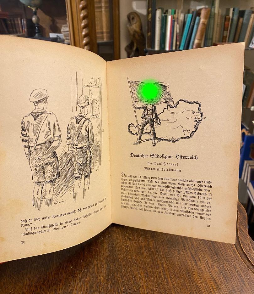 Auerbach, August Berthold. – Sixtus, Albert (Hrsg): Auerbachs Deutscher Kinder-Kalender 1939 : 57. Jahrgang. Leipzig, Verlag von Auerbachs Deutschem Kinderkalender (L. Fernau), (1938). 8° (21x16), XVI, 143 S., mit farb Frontispiz und zahlr. Textillustrationen, 8 fotograf Aufnahmen auf 4 Tafeln, roter Oln gewachst mit TitelPräg, WerbeVorsätze, Frontispiz verso mit Weihnachtswidmung der Oma 1938, teils leicht braunfleckig, ordentliches Exemplar, [= Auerbachs Kinderkalender 57 (1939)], es fehlt die Spielbeilge im Rückendeckel.–