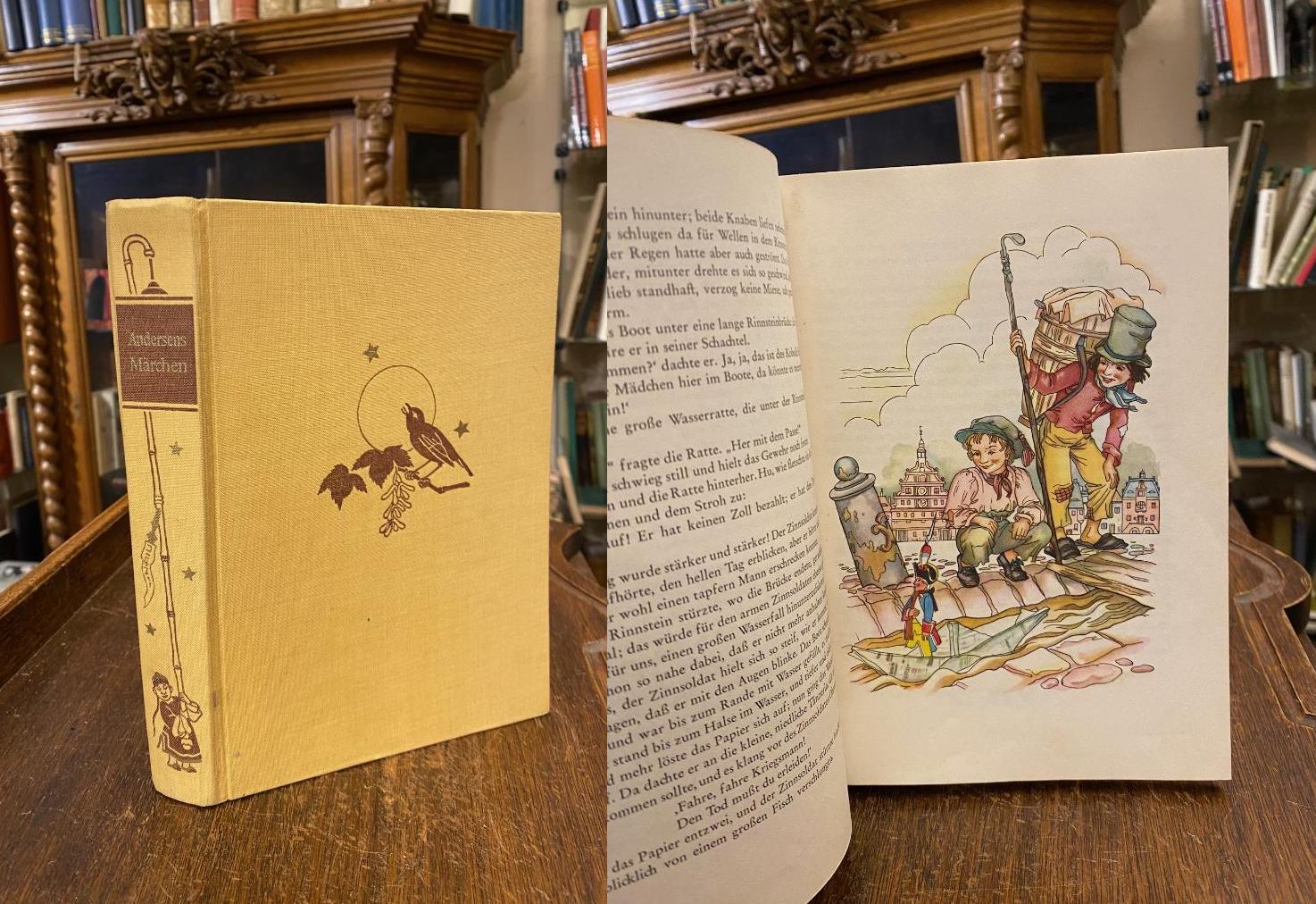 Andersen, Hans Christian (Text) / Koser-Michaels, Ruth (Ill): Märchen von Hans Christian Andersen : Mit 100 Bildern nach Aquarellen von Ruth Koser-Michaels. München, Droemer Knaur, (1969). 8° (22x16), 359 S., brauner Oln mit kleiner D/RIllustration, Einband/Schnitt gering fleckig, Weihnachtswidmung 1971 von Oma auf Vortitel, Register mit 3 kleinen Markierungen, genutztes aber pfleglich behandeltes Exemplar, [= Knaurs Märchenbücher], Andersen-Märchenausgabe, erstmals erschienen 1939, mit den Bildern von Ruth Koser-Michaels, die mit ihren Bildern zu den Knaur Märchenbüchern die Vorstellung und Phantasie ganzer Generationen beeinflusst hat.–
