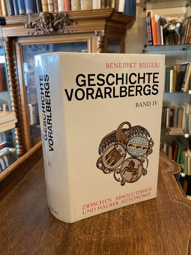 Bilgeri, Benedikt: Geschichte Vorarlbergs : Band IV (1719-1918): Zwischen Absolutismus und halber Autonomie. Band 4 (von 5), Wien-Köln-Graz, Hermann Böhlaus Nachf, 1982. gr8° (23x15), 733 S., 1 Bl., mit einigen teils farb Tafeln, heller Oln mit ill OU, nahezu ungelesen, schönes gepflegtes Exemplar,