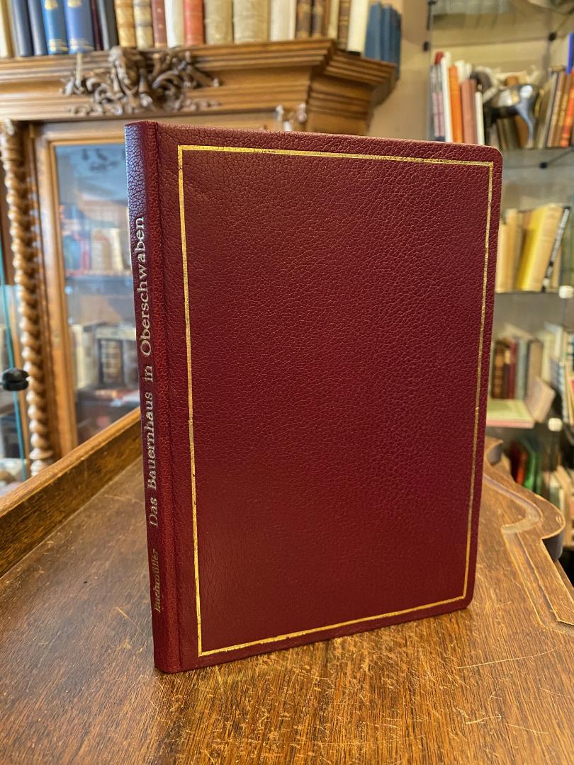 Buchmüller, Karlheinz: Das Bauernhaus in Oberschwaben. Mit einer historischen Einführung von Wolf Bartholomä und einem Kurzführer durch das Bauernhaus-Museum in Wolfegg. Stuttgart, Wolfegger Reihe im W.B.Literatur-Vertrieb, (1982). 8° (22x15), 131, (4) S., zahlr. Grund- und Aufrisse und fotograf Aufnahmen, teils auf gefalteten Tafeln, roter Ledereinband mit goldFiletten und silberRückentitel, sauber und wohlerhalten, [= Wolfegger Reihe], Vorzugsausgabe in Ganzleder aus der Bibliothek des Autors.–