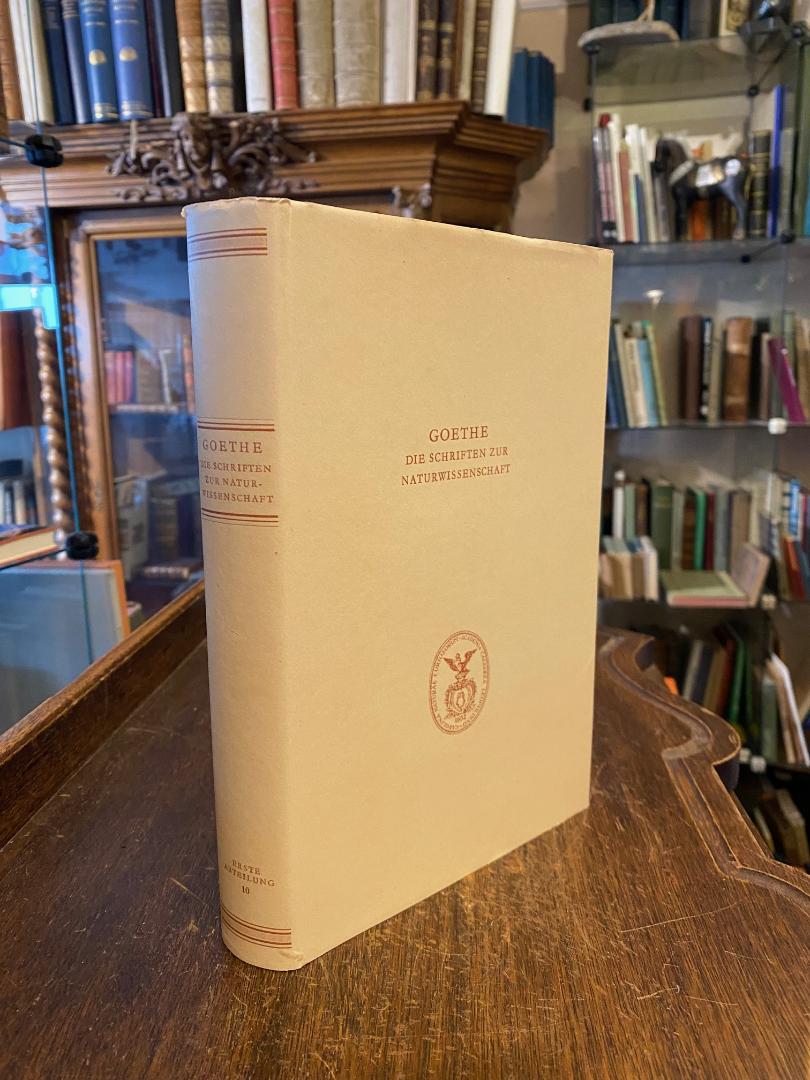 Goethe, Johann Wolfgang von (1749-1832). – Leopoldina-Ausgabe. – Kuhn, Dorothea (Bearb): Goethe : Leopoldina-Ausgabe : I. Abteilung (Texte); Band 10: Aufsätze, Fragmente, Studien zur Morphologie. Band 10 von 11, Weimar, Hermann Böhlau’s Nachf, 1964. gr8° (24x16), VII, 408 S., mit 27 Tafeln, heller Oln mit OU, Vorsatz braunrandig, ohne Gebrauchsspuren, wohl ungelesen, [= Goethe – Die Schriften zur Naturwissenschaft; I. Abteilung (Texte); Band 10 : Vollständige mit Erläuterungen versehene Ausgabe im Auftrage der Deutschen Akademie der Naturforscher Leopoldina : begründet von K. Lothar Wolf und Wilhelm Troll : herausgegeben von Dorothea Kuhn und Wolf von Engelhardt], [Hagen, Handbuch der Editionen S.187, 2 Abt. I, 10].–